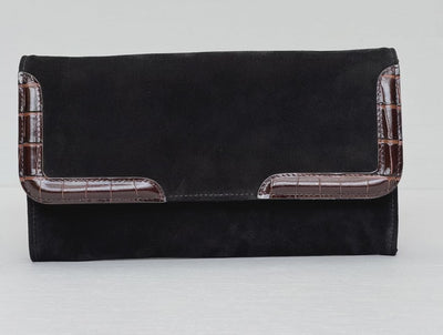 Elevate your wardrobe with the Monaco Noir Clutch, a luxury black suede bag designed for both elegance and versatility. Featuring rich suede paired with dark brown croc-embossed leather corners, this clutch embodies timeless sophistication with a modern twist. A detachable gold-tone chain transforms it from a refined evening clutch into a chic shoulder bag, perfect for nights out, special events, or elevated everyday styling. Designed to make a quiet statement wherever you go.
